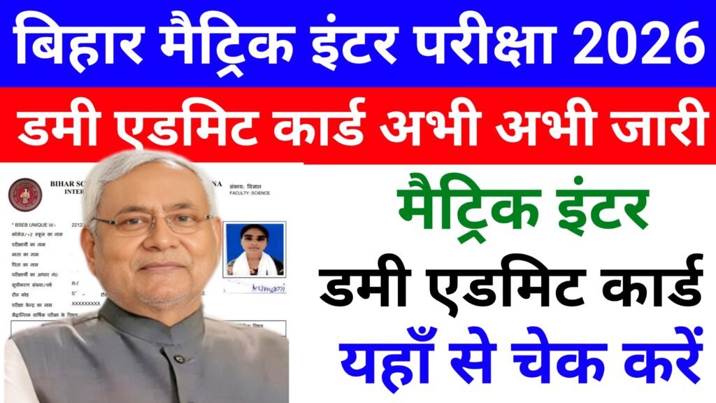 Bihar Board 10th 12th Dummy Admit Card 2026 Download: मैट्रिक इंटर डमी एडमिट कार्ड जारी, यहां से डाउनलोड शुरू:- बिहार बोर्ड द्वारा मैट्रिक इंटर फाइनल परीक्षा 2026 का डमी एडमिट कार्ड जारी कर दिया गया है जितने भी विद्यार्थी फाइनल परीक्षा 2026 में देने वाले हैं आप लोगों के लिए खुशखबरी है क्योंकि आप लोगों … Continue reading Bihar Board 10th 12th Dummy Admit Card 2026 Download: मैट्रिक इंटर डमी एडमिट कार्ड जारी, यहां से डाउनलोड शुरू