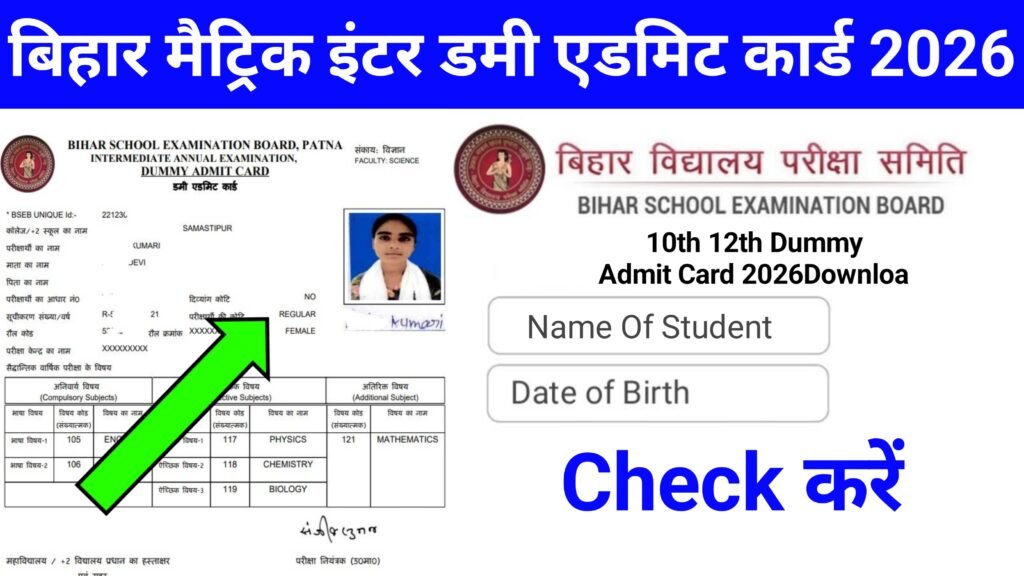 Bihar board 10th 12th Dummy Admit Card 2026 Download: बिहार बोर्ड ने अचानक मैट्रिक और इंटर का डमी एडमिट कार्ड जारी, यहाँ से डाउनलोड करें बिहार स्कूल एग्जामिनेशन बोर्ड की तरफ से जितने भी विद्यार्थी मैट्रिक इंटर की फाइनल परीक्षा फरवरी 2026 में देने वाले हैं इन सभी विद्यार्थियों के लिए जो फाइनल परीक्षा का … Continue reading Bihar board 10th 12th Dummy Admit Card 2026 Download: बिहार बोर्ड ने अचानक मैट्रिक और इंटर का डमी एडमिट कार्ड जारी, यहाँ से डाउनलोड करें।