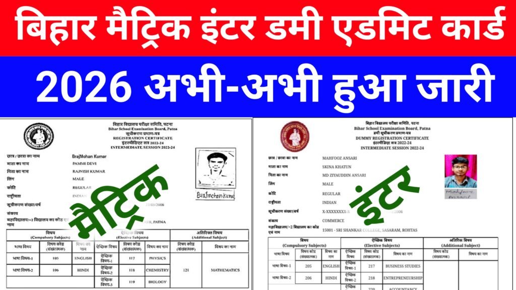 Bihar Board 10th 12th Dummy Admit Card Release 2026: बिहार बोर्ड वार्षिक परीक्षा 2026 का डमी एडमिट कार्ड हुआ जारी, यहाँ से डाउनलोड करें। बिहार विद्यालय परीक्षा समिति समिति के द्वारा मैट्रिक इंटर 2026 में वार्षिक परीक्षा शामिल होने वाले लाखों विद्यार्थी काफी समय से इंतजार कर रहे हैं कि कब डमी एडमिट कार्ड जारी … Continue reading Bihar Board 10th 12th Dummy Admit Card Release 2026: बिहार बोर्ड वार्षिक परीक्षा 2026 का डमी एडमिट कार्ड हुआ जारी, यहाँ से डाउनलोड करें।