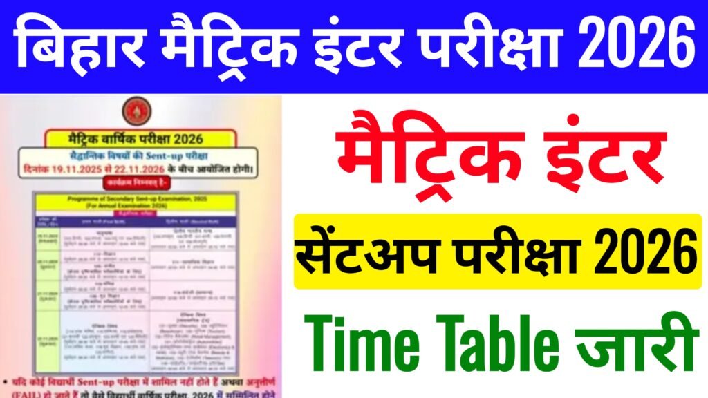 Bihar Board 10th 12th Sent-UP Exam 2026 Time Table: कक्षा 10वीं 12वीं के लिए सेंट-अप परीक्षा का टाइम टेबल जारी, यहां से करें डाउनलोड:- नमस्कार दोस्तों अगर आप भी बिहार बोर्ड के विद्यार्थी हैं और आप मैट्रिक और इंटर में अध्ययन कर रहे हैं तो आप सभी के लिए बहुत बड़ी न्यूज़ बिहार बोर्ड के … Continue reading Bihar Board 10th 12th Sent-UP Exam 2026 Time Table: कक्षा 10वीं 12वीं के लिए सेंट-अप परीक्षा का टाइम टेबल जारी, यहां से करें डाउनलोड