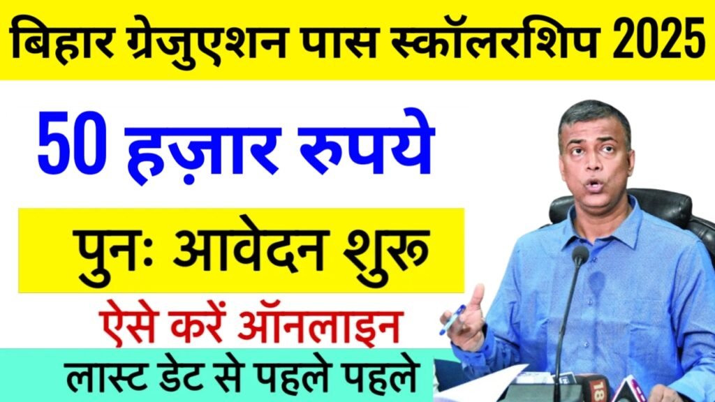 Bihar Graduation Pass Scholarship 50000 Online Apply: ग्रेजुएशन पास के लिए शानदार मौका ₹50,000 के लिए ऑनलाइन आवेदन प्रारंभ:- मुख्यमंत्री कन्या उत्थान योजना के अंतर्गत बिहार ग्रेजुएशन पास विद्यार्थियों को ₹50,000 की स्कॉलरशिप के लिए ऑनलाइन आवेदन की प्रक्रिया शुरू कर दी गई है आप भी बिहार बोर्ड के विद्यार्थी है और बिहार से ग्रेजुएशन … Continue reading Bihar Graduation Pass Scholarship 50000 Online Apply: ग्रेजुएशन पास के लिए शानदार मौका ₹50,000 के लिए ऑनलाइन आवेदन प्रारंभ
